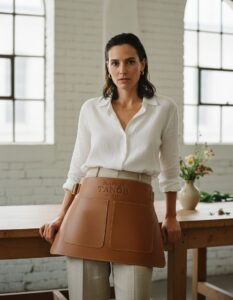 Confectionnés à la main, ces demi-tabliers au design épuré offrent une protection légère et fonctionnelle, idéale en cuisine, en atelier ou en service.
